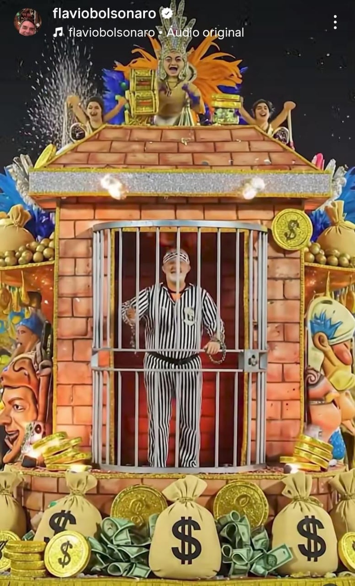 O desfile fictício divulgado por Flávio Bolsonaro também tem uma escultura do “Careca do INSS”, em referência às fraudes em pensões e aposentadorias, e carros alegóricos que representam o Banco Master e os Correios.