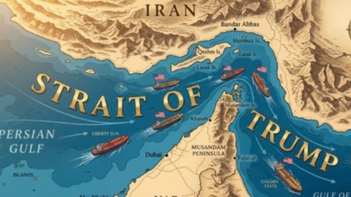 O presidente dos Estados Unidos, Donald Trump, compartilhou na quarta-feira (29) na rede Truth Social uma imagem que mostra o estratégico Estreito de Ormuz, localizado entre os golfos Pérsico e de Omã, com o nome “Estreito de Trump”.